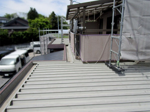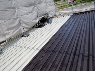 下塗り中。太陽光パネルや足場が影になるので慎重に塗装します。