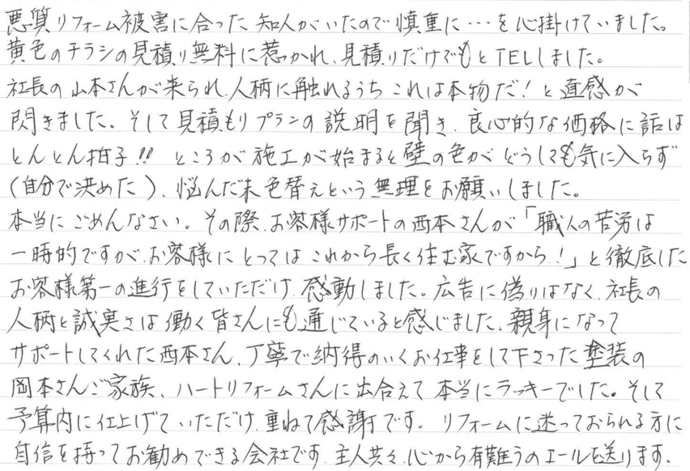 本当にごめんなさい。その際、お客様サポートの西本さんが「職人の苦労は一時的ですが、お客様にとってはこれから長く住む家ですから!」と徹底したお客様第一の進行をしていただけ感動しました。広告に偽りはなく、社長の人柄と誠実さは働く皆さんにも通じていると感じました。親身になってサポートしてくれた西本さん、丁寧で納得のいくお仕事をして下さった塗装の岡本さんご家族、ハ^トリフォームさんに出合えて本当にラッキーでした。そして予算内に仕上げていただけ、重ねて感謝です。リフォームに迷っておられる方に自信を持ってお勧めできる会社です。主人ともども、心から有難うのエールを送ります。
